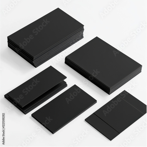 Sleek monochrome stationery set showcasing modern black business cards and matching blank paper