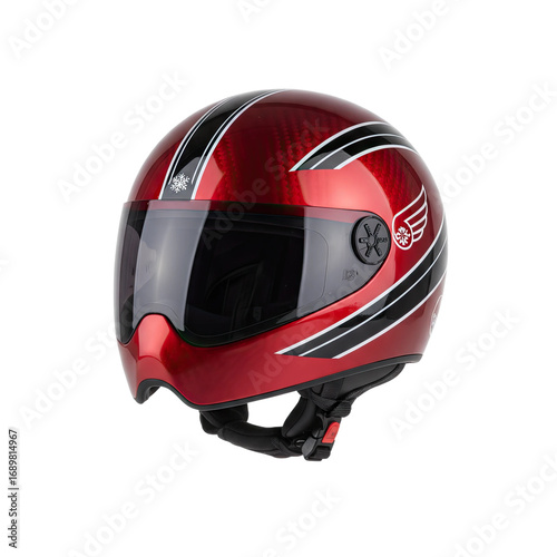 Sleek red motorcycle helmet with dynamic racing stripes and protective visor ready for adventure
