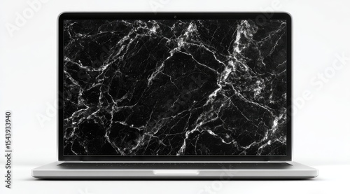 Sleek silver laptop displaying a black marble texture wallpaper on its screen against a plain white background