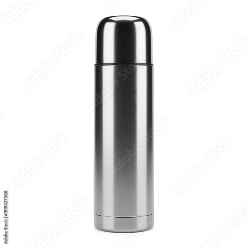 Sleek Stainless Steel Vacuum Flask Thermos Bottle for Hot or Cold Drinks, isolated on white background.