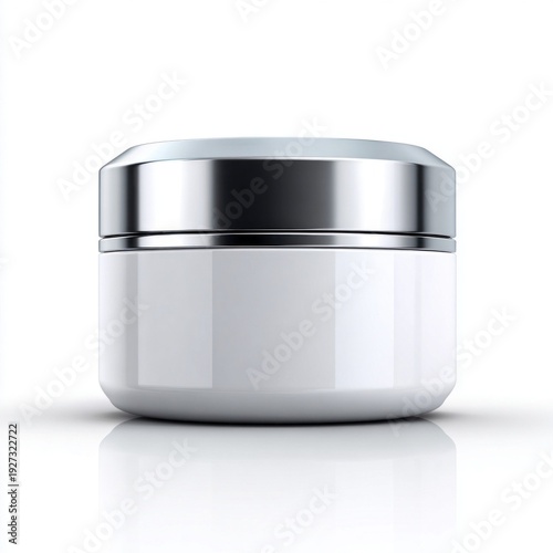 Sleek white cosmetic jar with a polished metallic silver lid on a reflective surface