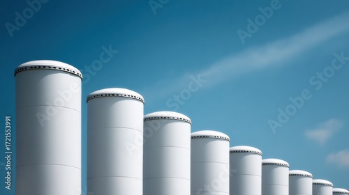 industrial, structure, white, blue, sky, minimal, modern, composition, calm, order, sleek, architecture, cylinder, symmetry, repetition, design, clean, futuristic, serene, environment, engineering, technology, perspective, pattern, alignment, urban, infrastructure, exterior, contemporary, simplicity, geometric, arrangement, vertical, tall, uniform, aesthetic, peaceful, skyward, horizon, clarity, industrialism, innovation