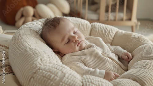 Sleeping infant, peacefully resting in a cozy round nest, surrounded by soft textures and gentle colors, creating a serene and calming atmosphere for relaxation and comfort