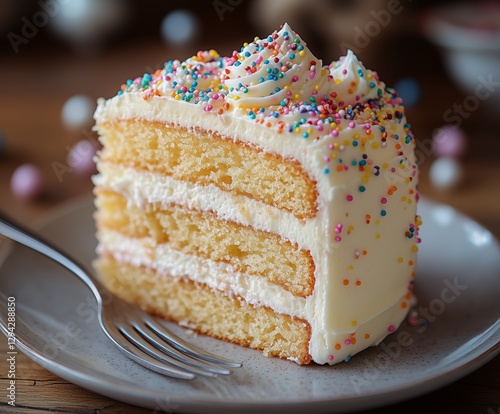 slice of vanilla birthday cake with cream and sprinkles on a plate with a fork