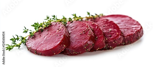 sliced, vibrant, deep, red, colours, white, background, garnished, fresh, green, thyme, sprig, elegant, presentation, meat, dish, cookery, epicure, food, italian, deli, prosciutto, charcuterie, healthy, organic, herb, decoration, platter, eatery, snack, culinary, meal, promotion, closeup, texture, luxury, table, style, visual, display, serving, feast, nourishment, elegance, aesthetic