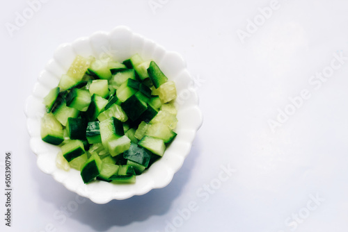 Sliced cucumber in a cube for salad in a plate on a white table.