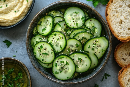 Sliced cucumber salad with parsley and black pepper seasoning in bowl