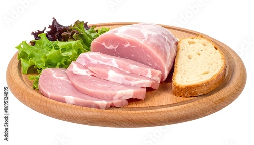 meat, sliced, cured, pork meat, ham, bread, lettuce, salad, food, plate, wooden, round, fresh, healthy, diet, protein, delicious, tasty, cooked, prepared, slice, raw, cut, nourishment, vitamin, pale, pink, light, natural, foodstuff, alimentary, wholesome, organic, ingredient, cookery, dish, portion, cutlery, serving, appetising, savoury, photo