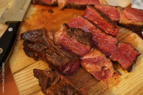 Sliced medium rare grilled Beef steak Ribeye on cutting board on wooden background