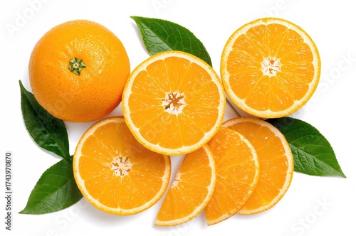 Sliced orange segments and halves with leaves on a white backdrop, isolated with clipping path