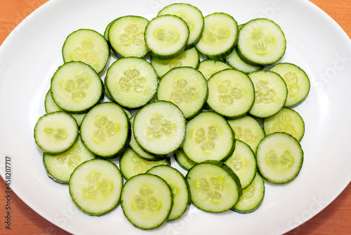 Sliced oval shape fresh cucumber Cucumis sativus in a white plate.Top view.
