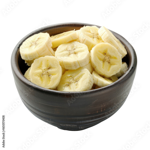 Sliced pieces of banana in bowl front view isolate on transparency background