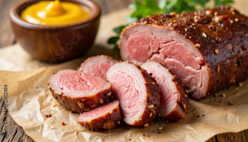 meat, roast, sliced, mustard, herb, food, table, delicious, cookery, brown, favor, savoury, lunch, dinner, dish, ingredient, cooking, epicure, spice, texture, closeup, presentation, dining, kitchen, rustic, appetising, meal, beef, pork meat, grilled, healthy, natural, organic, serving, eatery, seasoning, culinary, receipe, wooden, bowl, background, plated, intimate, share, festive, catering, family, event
