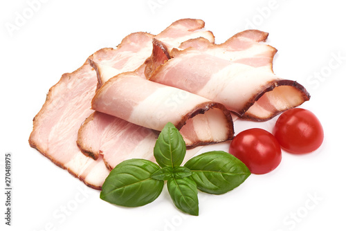 Sliced Smoked bacon, pork brisket, macro, isolated on white background