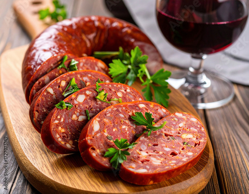 Sliced spicy salami on a rustic wooden board with parsley garnish, served alongside a glass of red wine, creating a gourmet charcuterie presentation