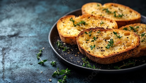 Slices of garlic bread with black pepper and thyme on a plate over a dark background, close-up view. Space for text or product presentation.