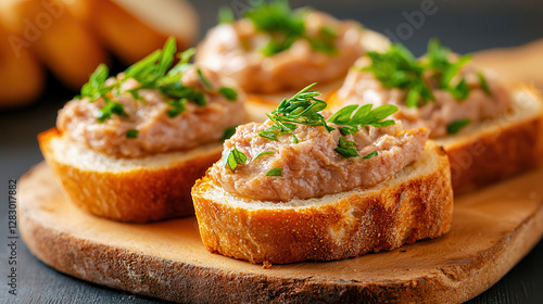 Slices of rustic bread topped with classic French pâte and garnished with fresh herbs are arranged on wooden board, creating warm and inviting presentation