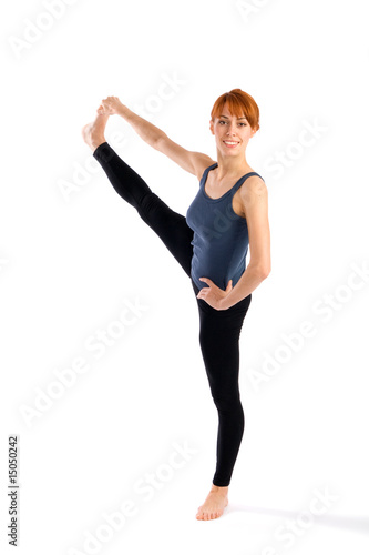 exercising, woman, fitness, female, yoga, health, relaxed, smiling, smile, positive, joyful, cheerful, body, healthy, bodycare, exercise, fit, pose, posture, isolated, health care, feminine, stretching, relax, beauty, attractive, lifestyle, pretty, asana, people, white, background, physical exercise, practise, bending, copy space, barefoot beach, relaxation, aerobic, gymnastics, thin, slim, well-being, spandex, endurance, stamina, strength