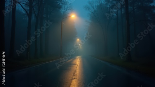 slippery, road, signs, front, foggy, forest, night, dim, street light, texture, reflective, tense, mysterious, atmosphere, dark, tree, moisture, dew, grunge, metal, warning, danger, caution, path, gravel, autumn, leaf, wet, ground, mist, lighting, detail, realism