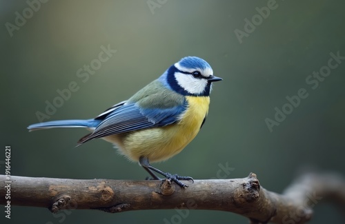 Small blue tit bird sits on wooden branch. Tiny avian creature with yellow breast and blue wings rests in green forest. Nature wildlife close-up.