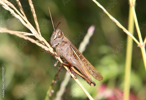Small brown grasshopper on a dried flower stalk in a natural outdoor setting