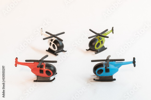 Small colorful helicopter toys isolated on a white background - air travel by helicopter concept