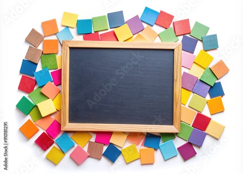 Small, colorful paint chips with smooth, matte chalkboard surfaces, perfect for writing and erasing, scattered on a white background, awaiting creative expression.