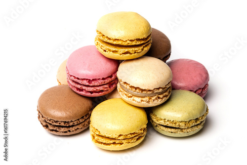 Small colorful tasty sweet original classic macaroons cakes isolated on white studio background