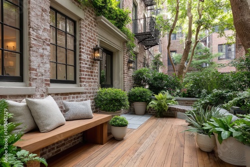 Small courtyard garden with wooden flooring, seating, and potted plants.