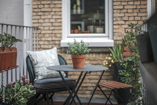 balcony, plant, table, chair, cosy, apartment, urban, city, decoration, exterior, home, house, furniture, potted plants, small, relaxing, comfortable, lifestyle, design, architecture, green, nature, outdoors, summer, spring, garden, flower, window, brick wall, metal, wood, pillow, home decor, interior design