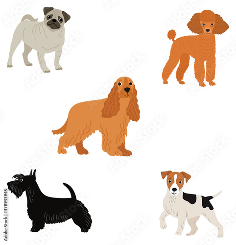 vector, set, dog, spaniel, pug, terrier, poodle, illustration, cartoon, cute, character, pet, animal, canino, puppy, funny, collection, domestic, graphic, group, happy, flat, mammal, design, drawing, pedigree, doggy, comic, breed