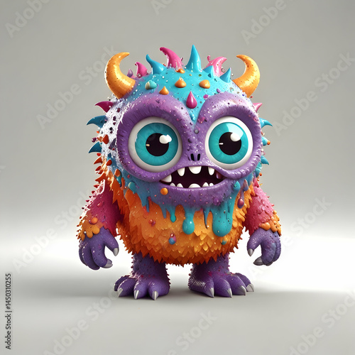 Small, friendly-looking monster, covered in colorful, sticky goo, stands against a white backdrop, its large, innocent eyes and playful expression creating a captivating scene