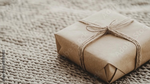 gift, present, wrapped, package, brown, paper, twine, string, knot, bow, fabric, knit up, texture, cosy, warm, rustic, simple, hand-made, natural, organic, craft, holiday, celebration, surprise, special, occasion, thank you, love, care, sharing, giving, receiving, sentiment, feeling, emotion, homemade, design, detail, closeup, topview, background, pattern