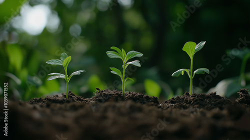 Small green seedlings growing in fertile soil, representing new beginnings, growth, and sustainability in natural environment