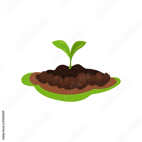 Small green sprout in the ground. Plant in soil. Nature theme. Flat vector for infographic poster about farming or gardening