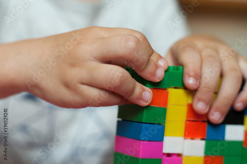 Small hands of the child collects the bright plastic colored Designer. Educational toys and Early learning