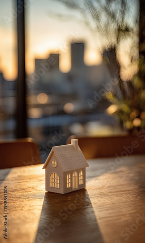 Small model house with glowing windows on a wooden table against a beautiful blurred city skyline at sunset