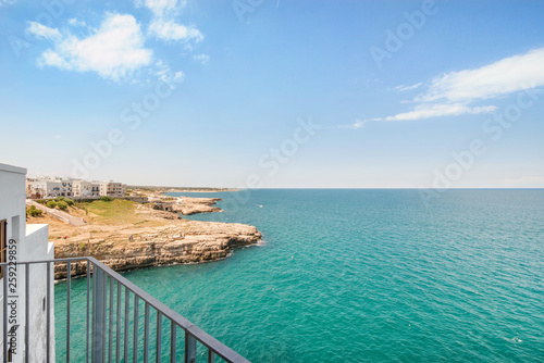 Small people is standing on beautiful cliffs next to mediterranean sea in Italy. Coast with an amazing view. Concept of wilderness in nature, travelling. Adventures, hiking, swimming, summer holiday