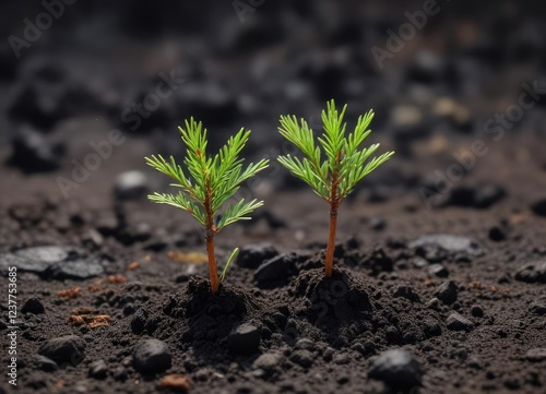 Small pine seedling emerging from blackened earth , charred trees, regeneration, forest fire