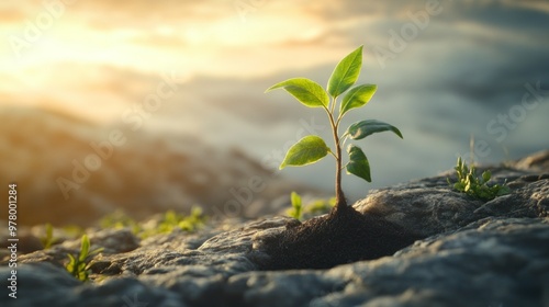 small plant growing out of rocky soil, symbolizing resilience and growth in challenging conditions. The warm, glowing light in the background suggests hope and new beginnings.