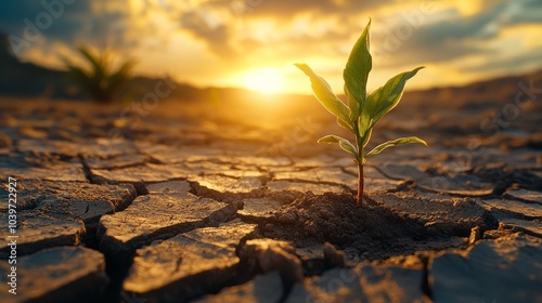 Small plant sprouting from dry, cracked soil in a desert landscape, illuminated by a golden sunset, symbolizing resilience and hope amidst adversity
