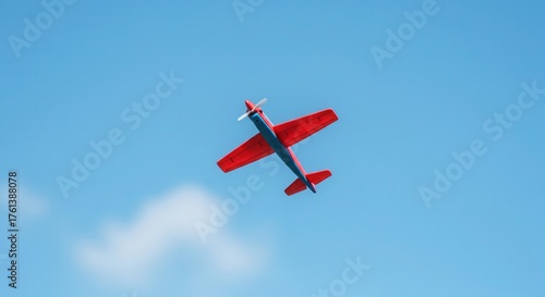 aeroplane, aircraft, flying, sky, blue, red, travel, transport, transportation, motion, freedom, skyward, journey, high, altitude, aviation, toy, model, propeller, wing, fuselage, adventure, exploration, hobby, leisure, fun, childhood, dream, aspiration, aerial, scenic, clear, summer, day, bright, high-coloured, movement, speed, distant, view, perspective, solo, flight, up, up high, beautiful, colourful