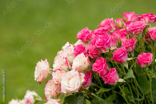 Small roses bouquet on green background with copy space. Floral greeting card mockup. Wedding invitation,happy mother day or Valentine day concept.