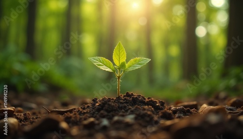 Small sprout growing from soil in a forest.Fresh start. New life. Hope. gardening, nature conservation, planting trees, sustainable gardening, environmental education, reforestation, spring planting,