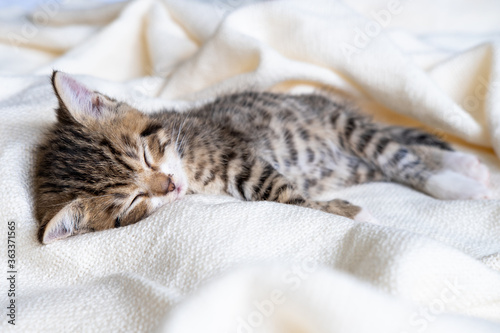 Small striped kitten sleeps covered with white light blanket. Concept of adorable pets