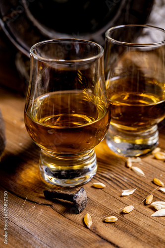 Small tasting glasses with aged Scotch whisky on old dark wooden vintage table with barley grains