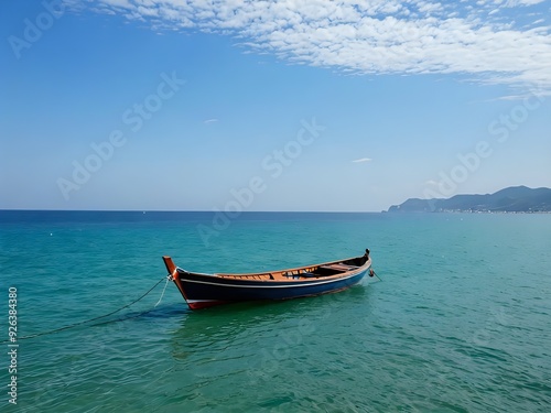 boat, wooden boat, turquoise water, blue skies, white cloud, calm water, sea, ocean, horizon, summer, vacation, travel, mediterranean sea, greece, italy, spain, coastline, nature, landscape, calmness, peace