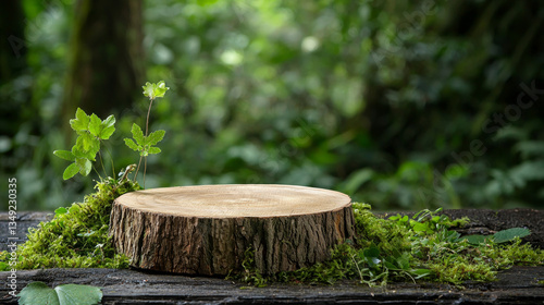 small wooden podium surrounded by lush green moss and delicate plants, creating serene and natural atmosphere in forest