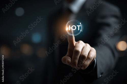 Smart business IOT, internet of things concept. Businessman touching IOT icon on virtual screen, connected internet network to access AI intelligence
