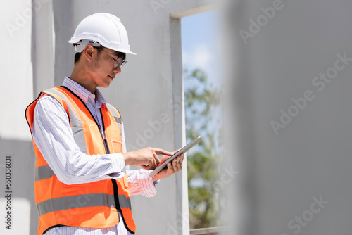 Smart civil architect engineer inspecting and working outdoors structure building site with blueprints. engineering and architecture concept.